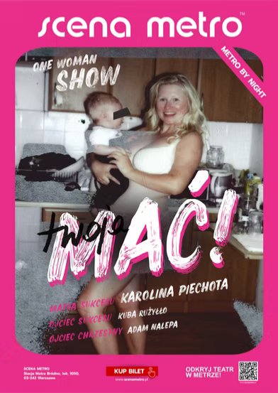 Przezabawny komedio - stand up o macierzyństwie, zrealizowali twórcy takich hitów jak: SNL Polska, The OFFICE.PL, OSIECKA czy KORONA KRÓLÓW. Gorąco zapraszamy wszystkie Matki, Kobiety oraz Superbohaterki na granicy obłędu na One Woman Show Twoja MAĆ!. Śmiejmy się, by nie zwariować!